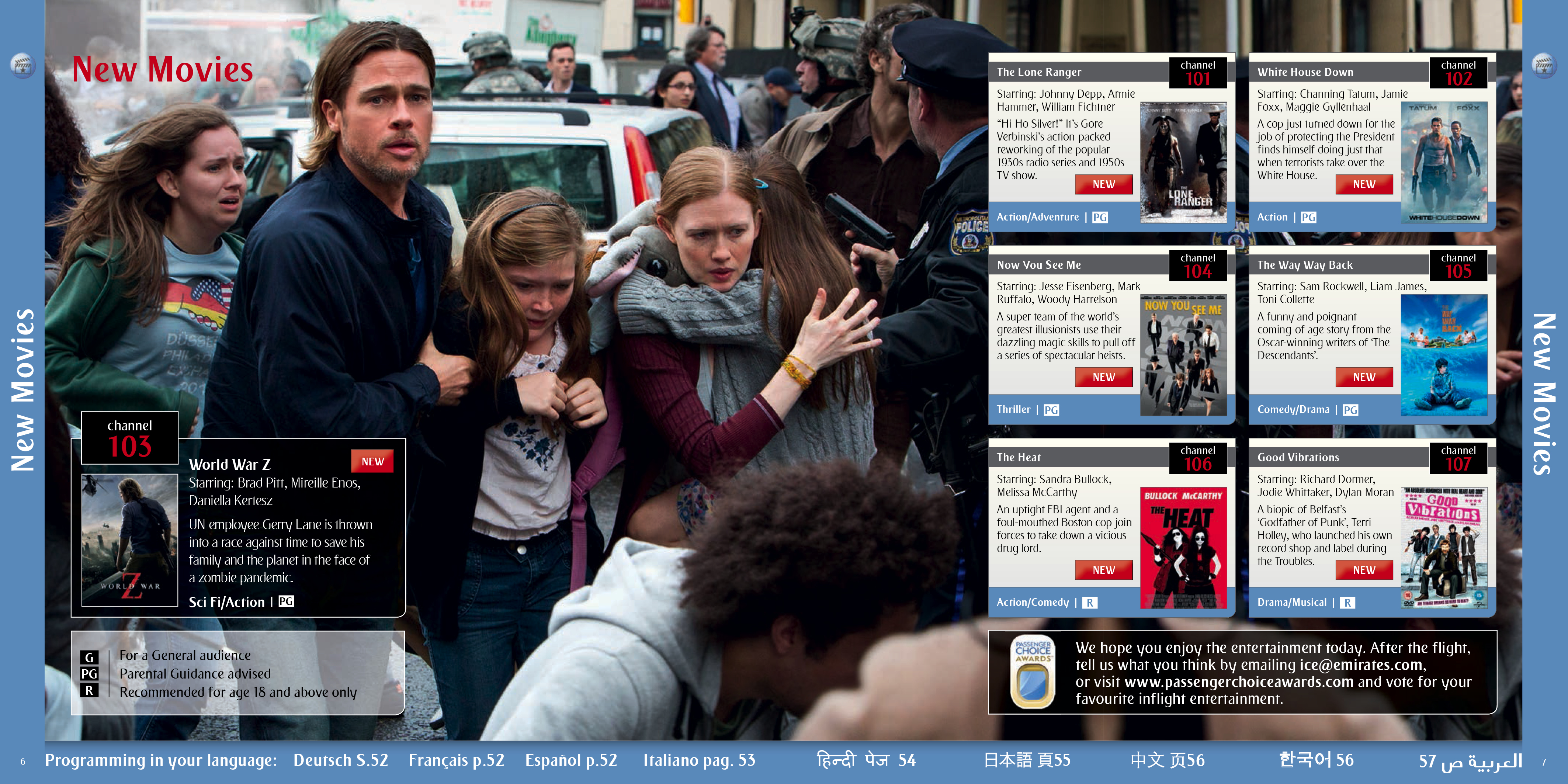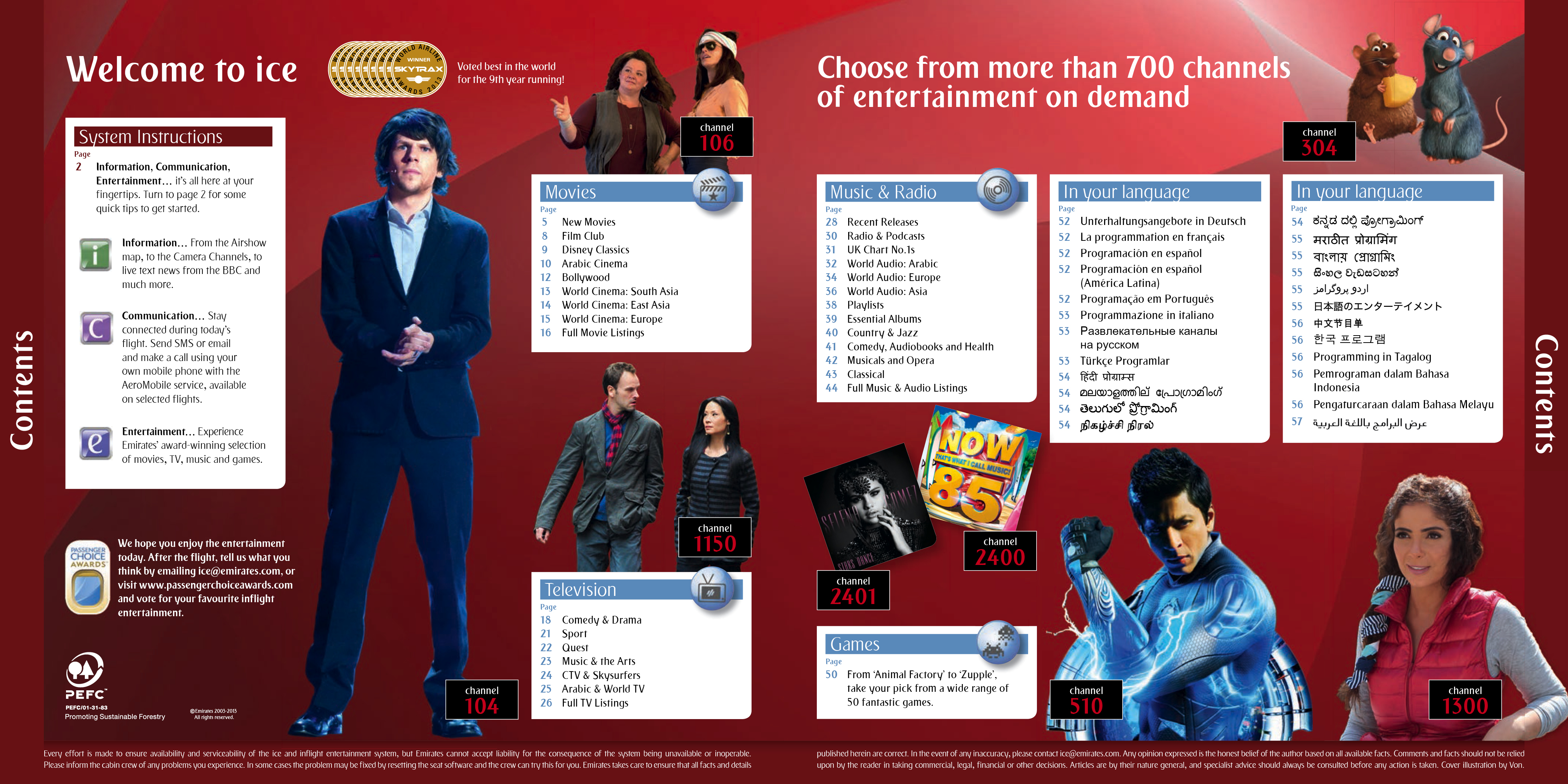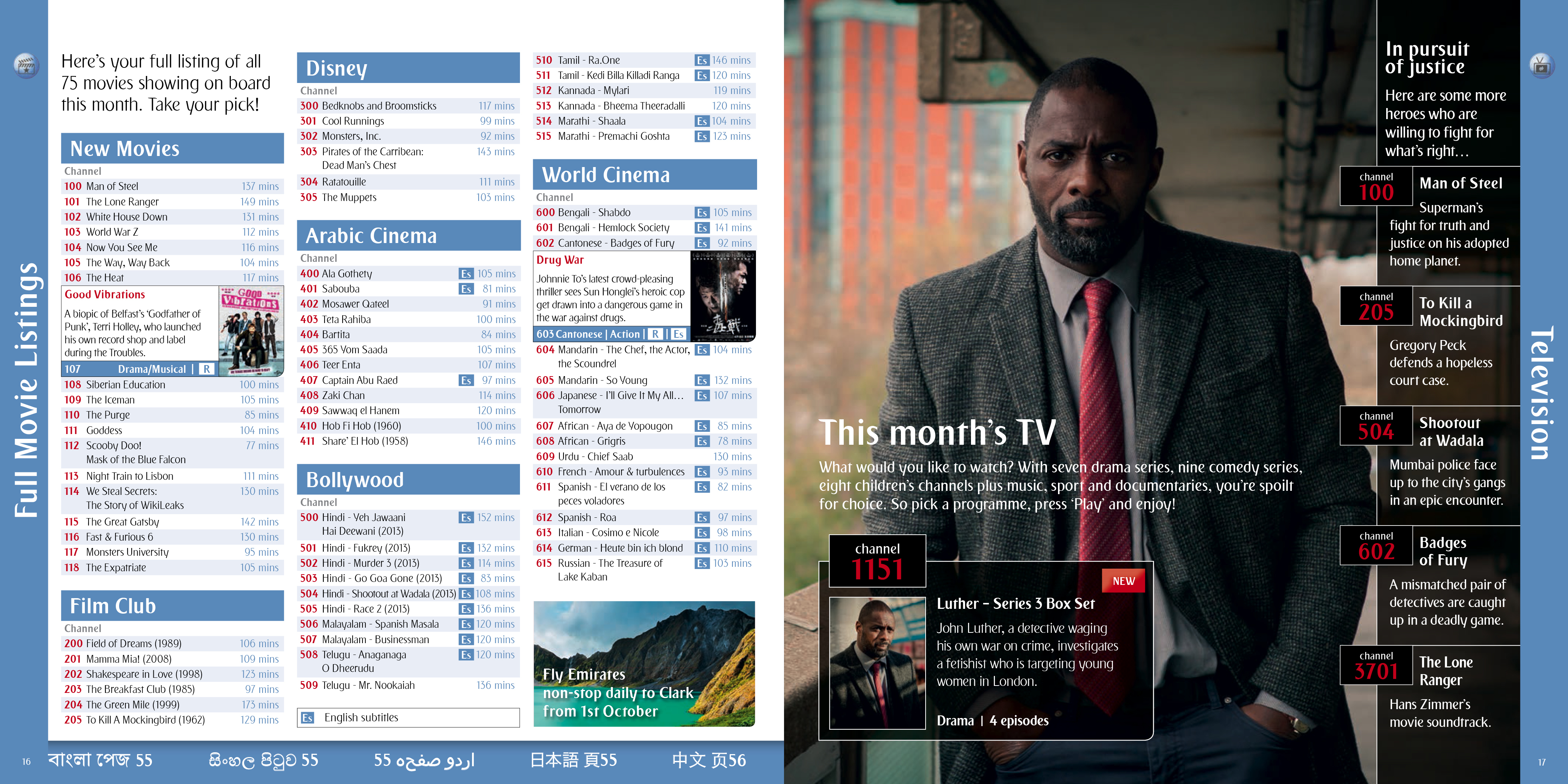 I worked with Emirates on the annual in flight entertainment listings brochure refresh. The covers were commissioned illustrations working from one of the feature presentations of the month on a new layout design and the interior content had re-designed layouts and grids to accommodate more photography to enhance the visual impact while still incorporating ever increasing content information. These also covered multiple languages for multi national regional specific content.