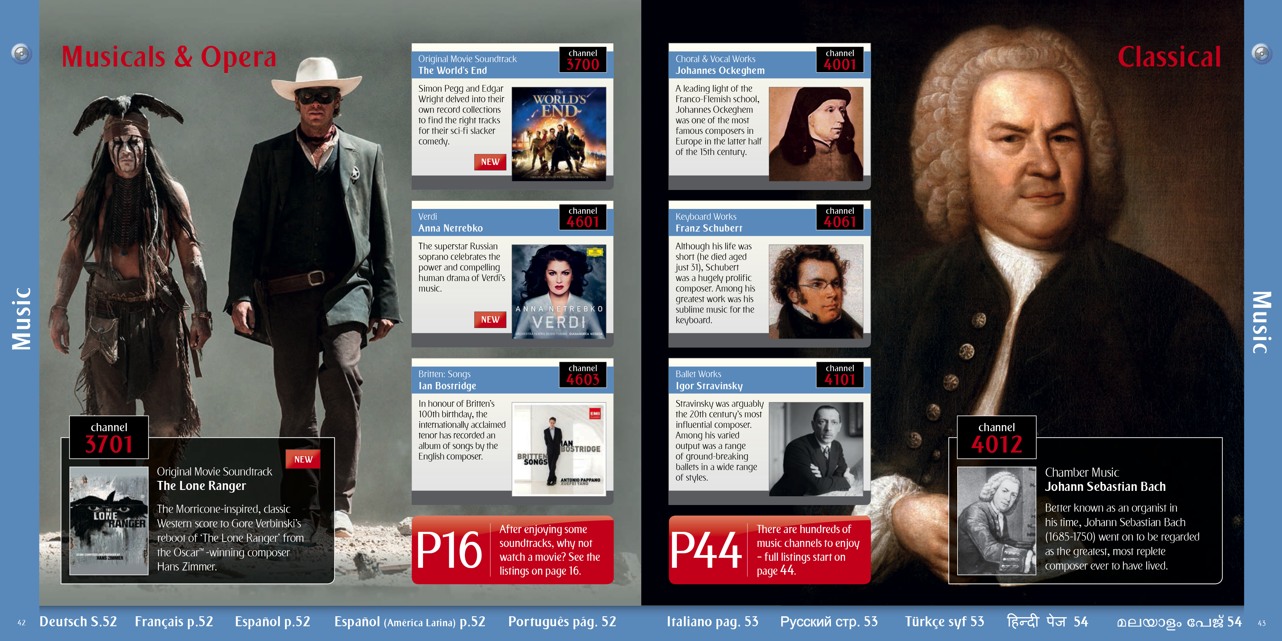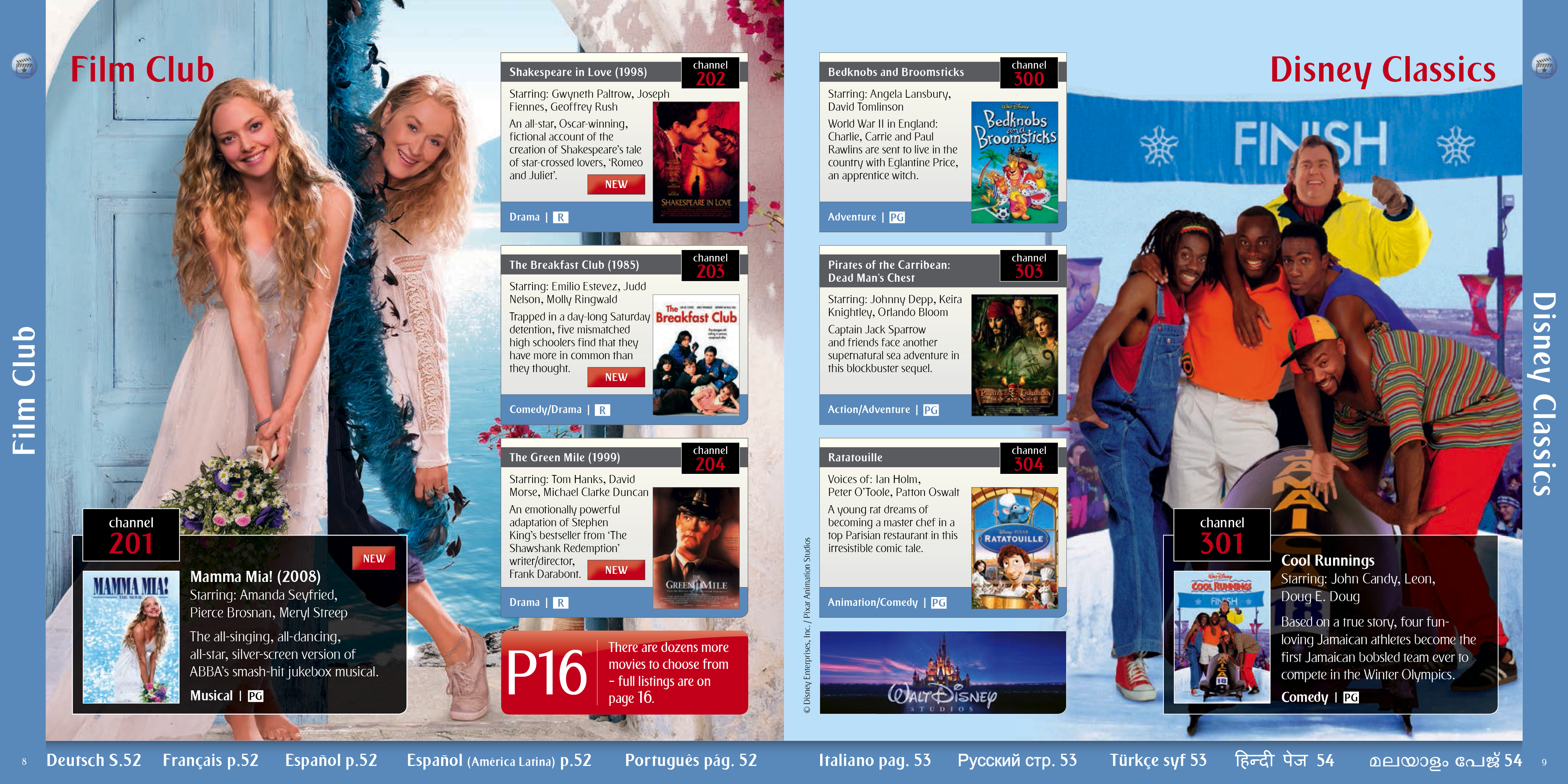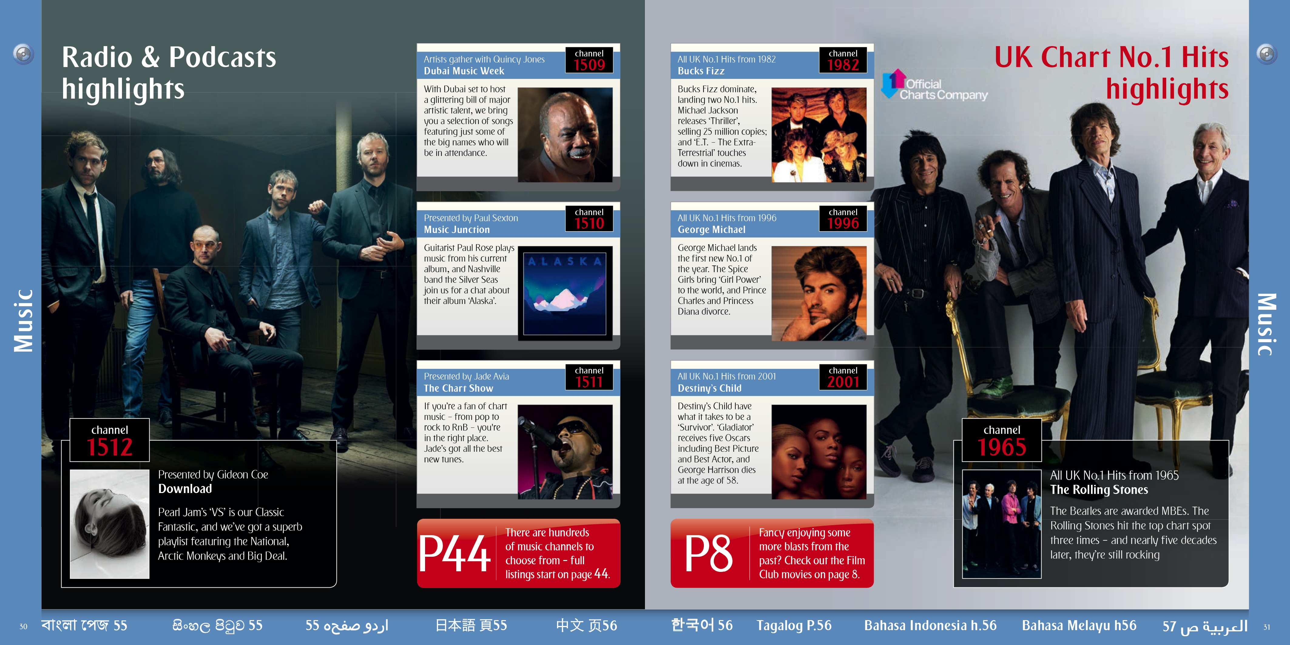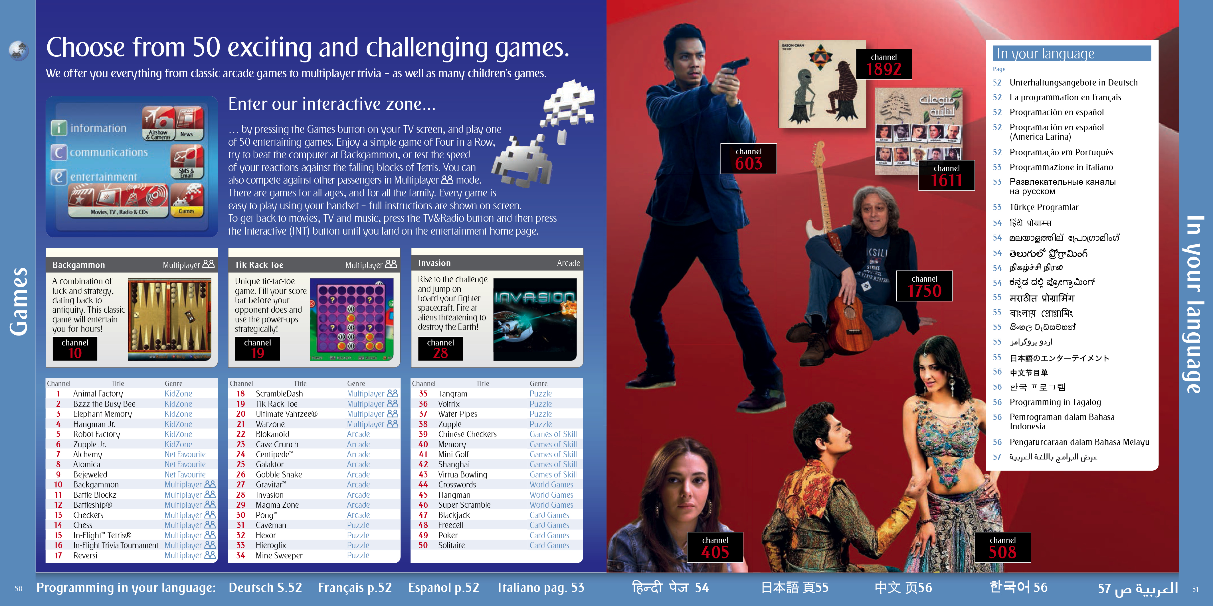 A selection of the interior pages of an in flight entertainment pages and listings