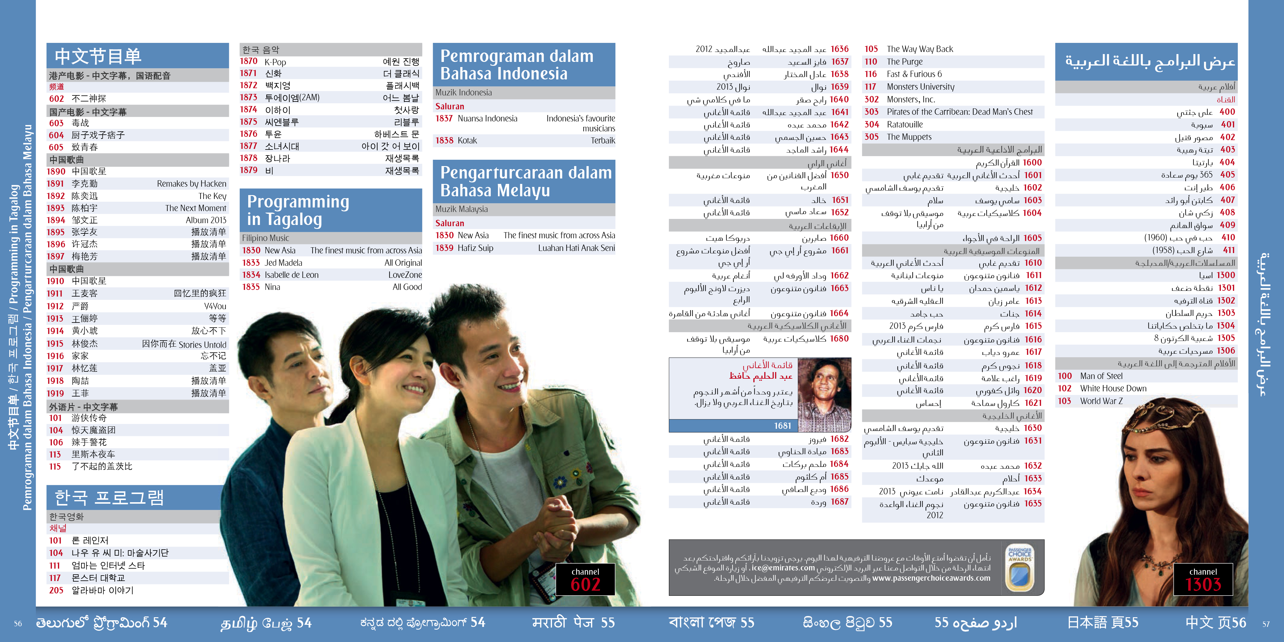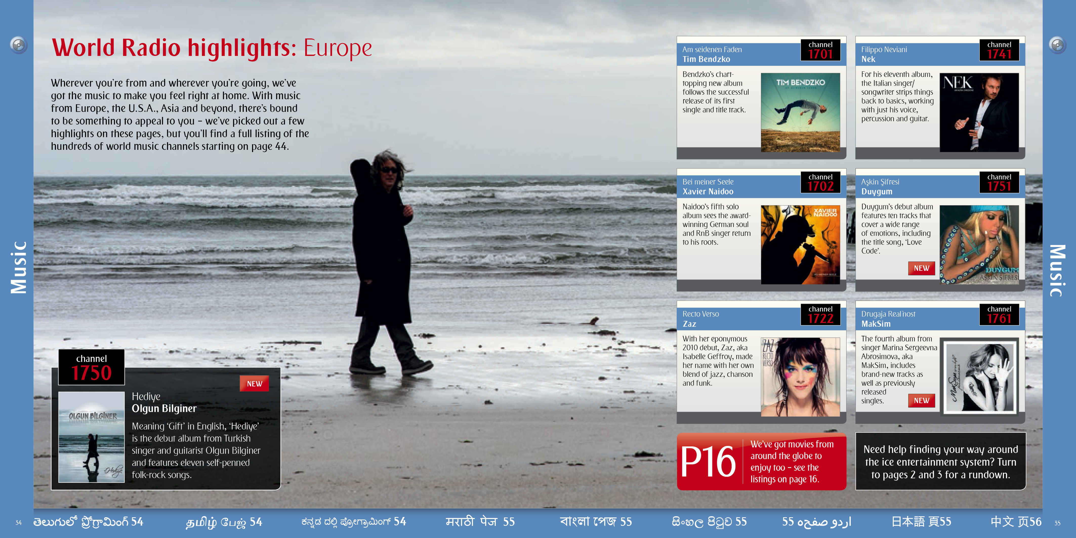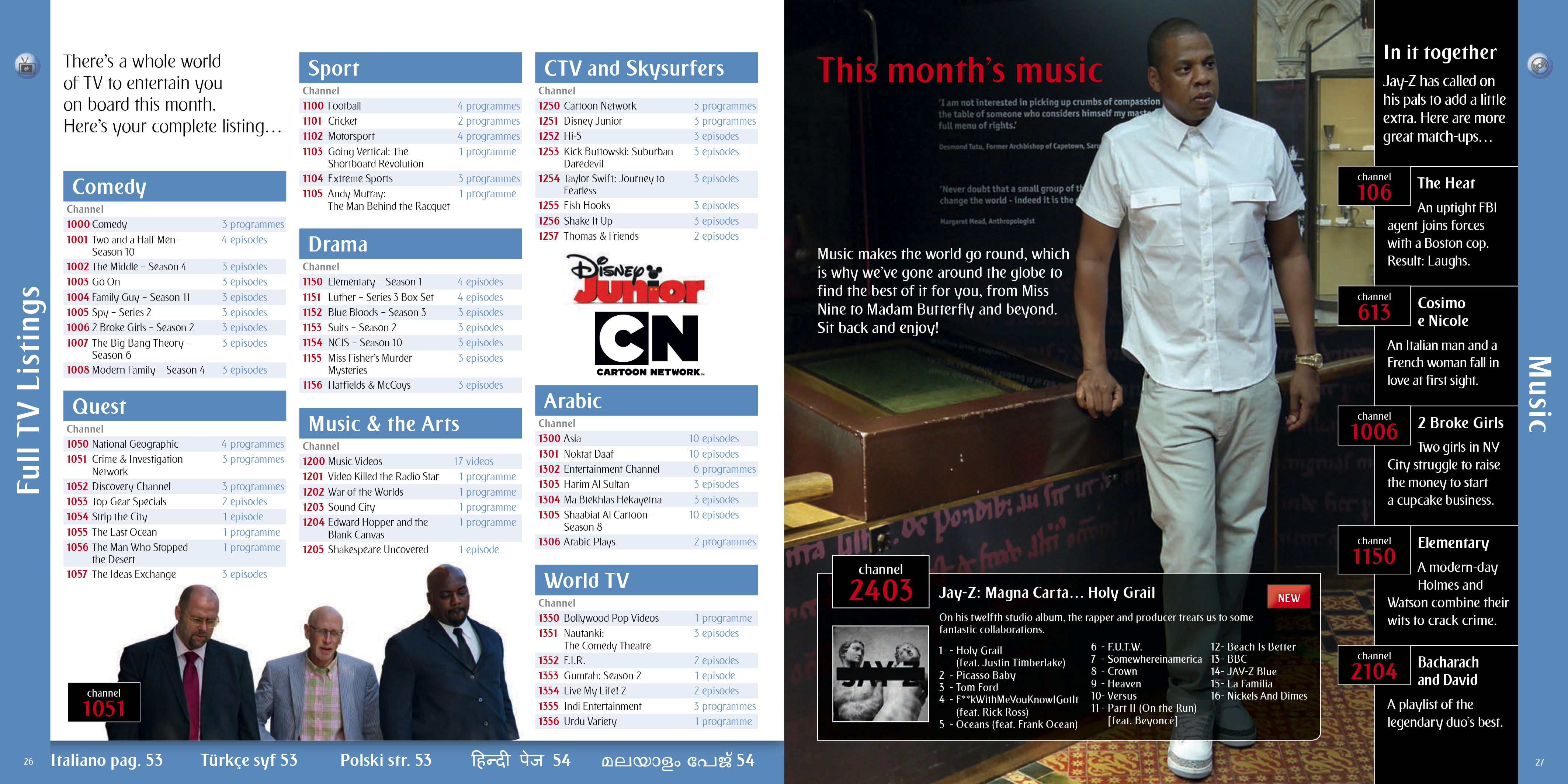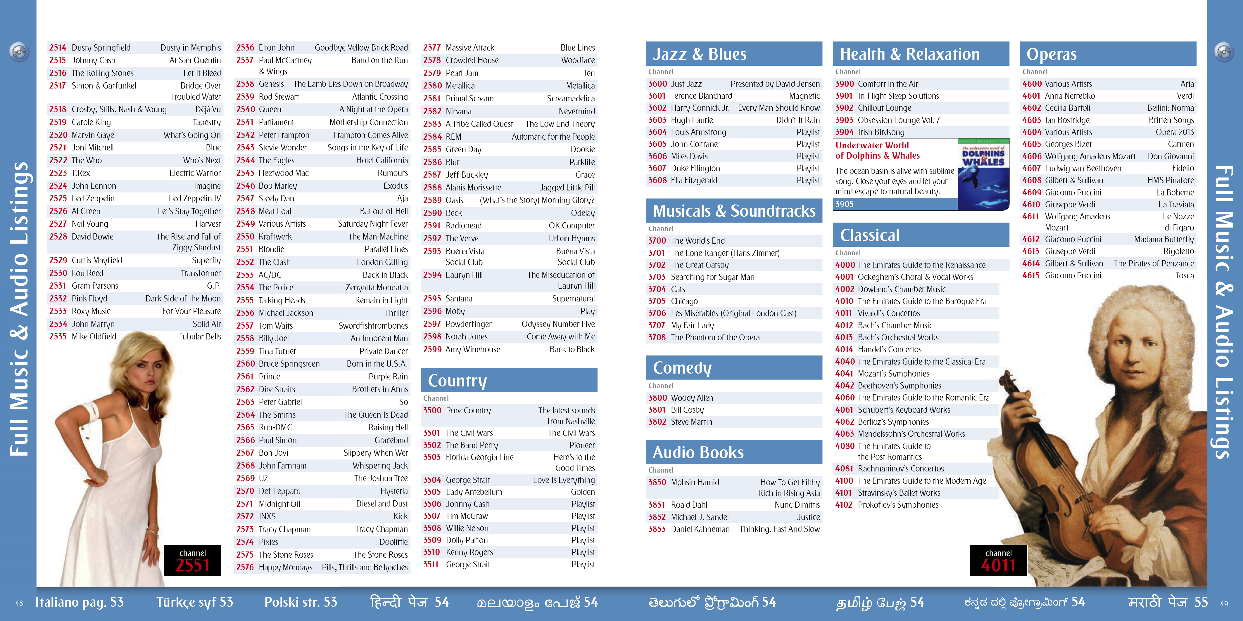 A selection of the interior pages of an in flight entertainment pages and listings