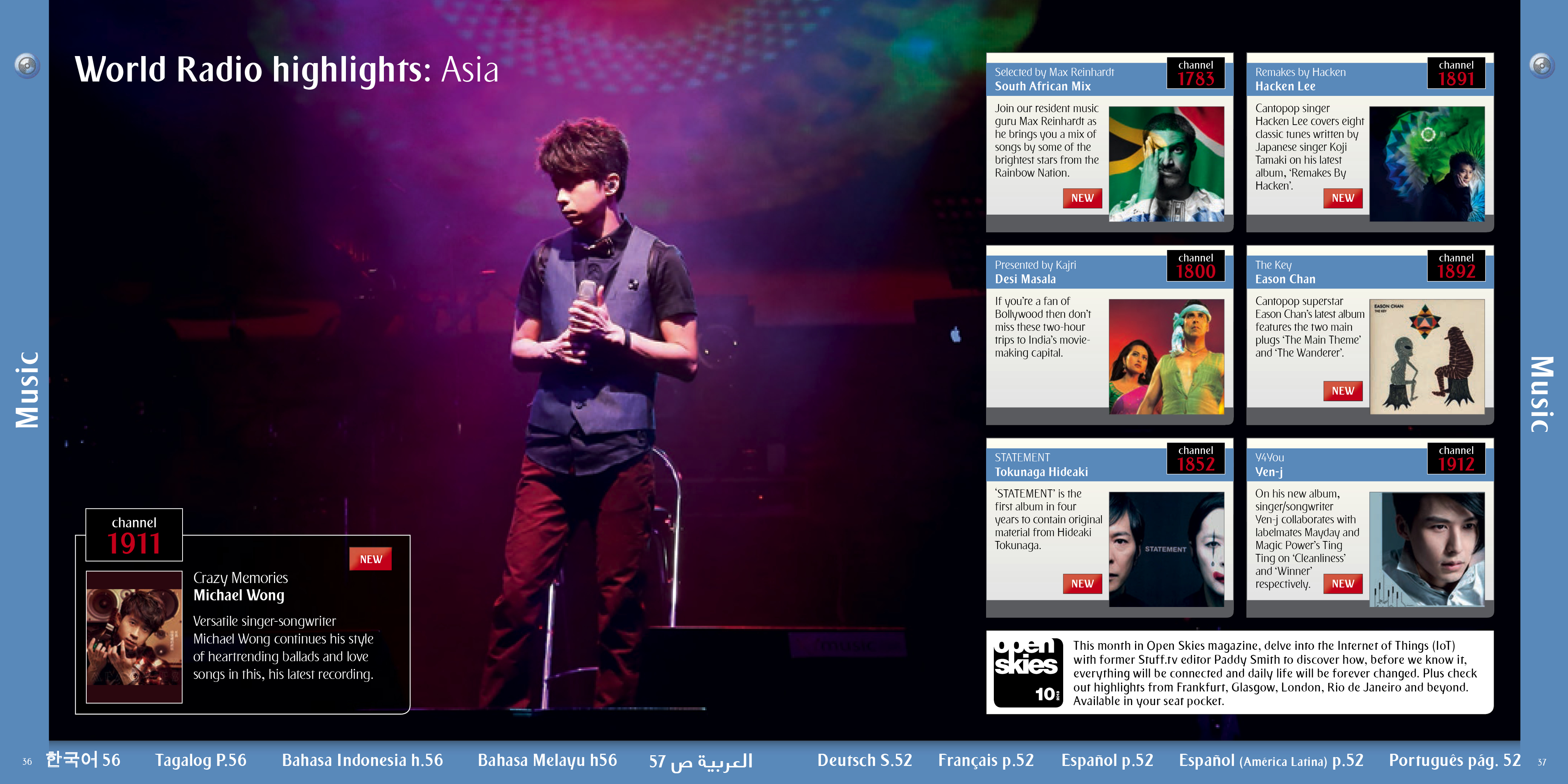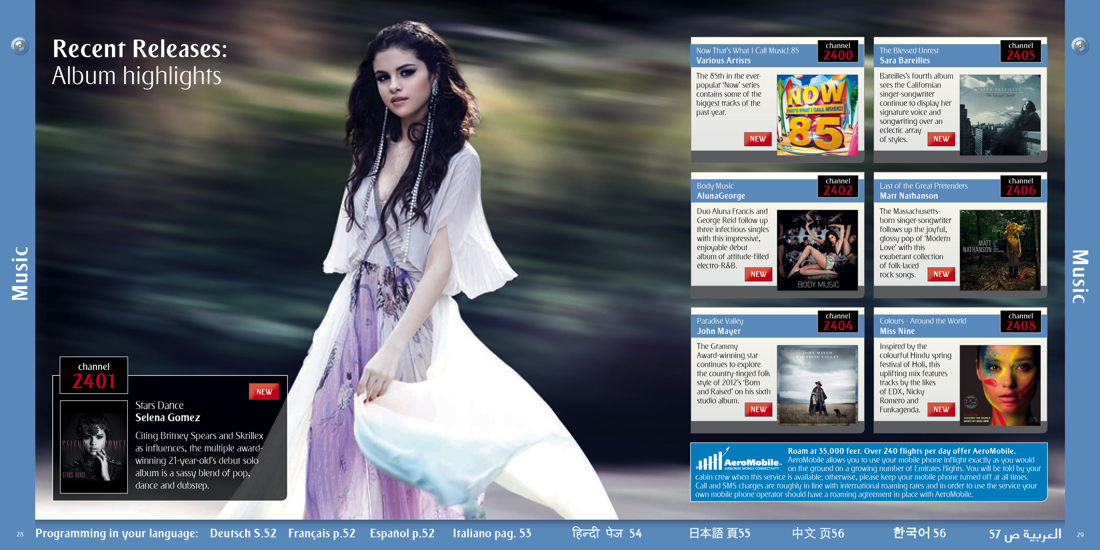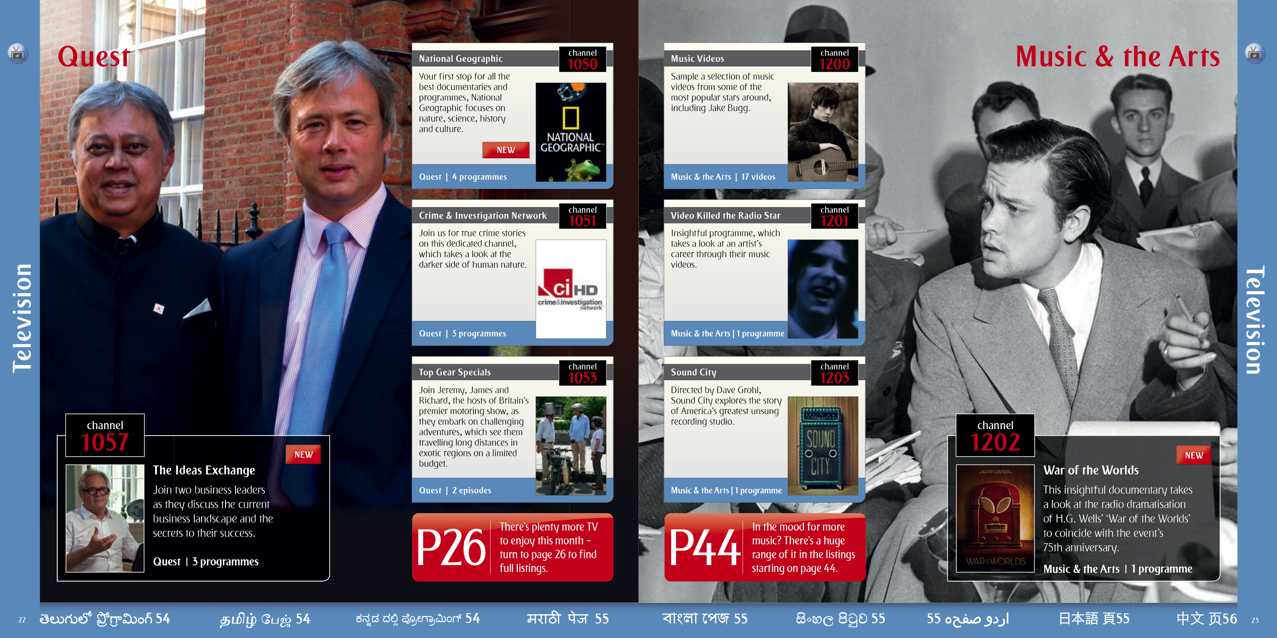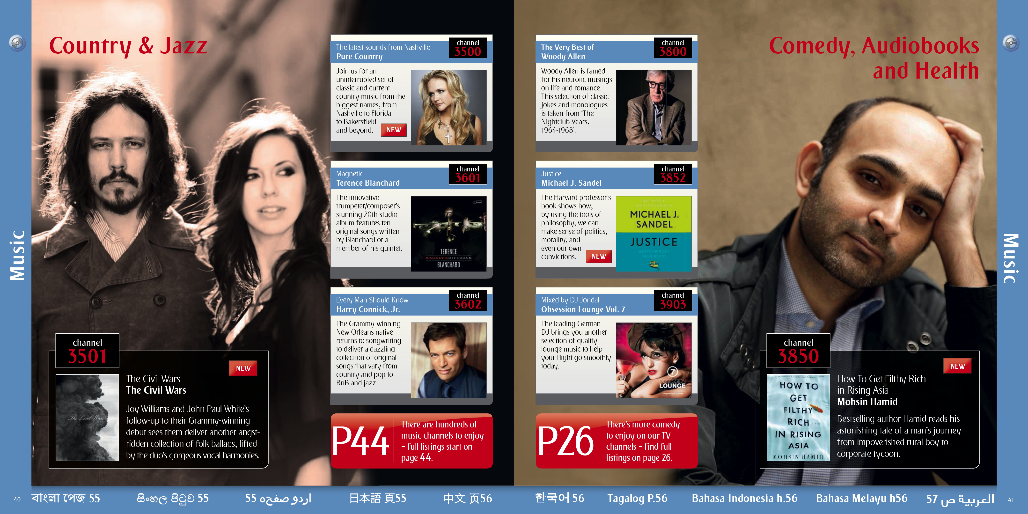 A selection of the interior pages of an in flight entertainment pages and listings